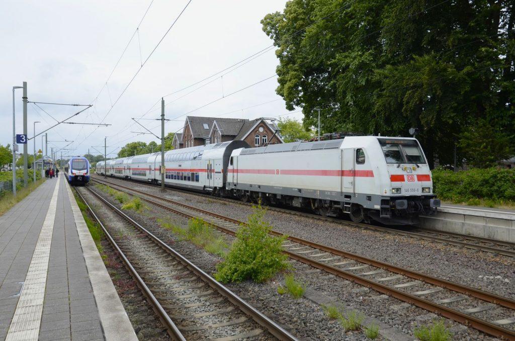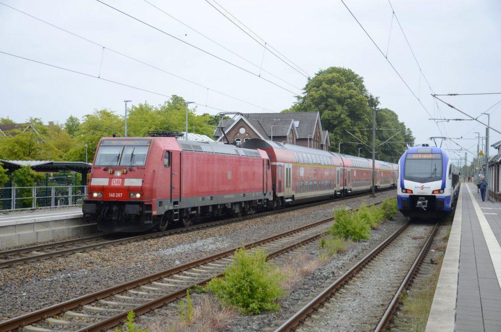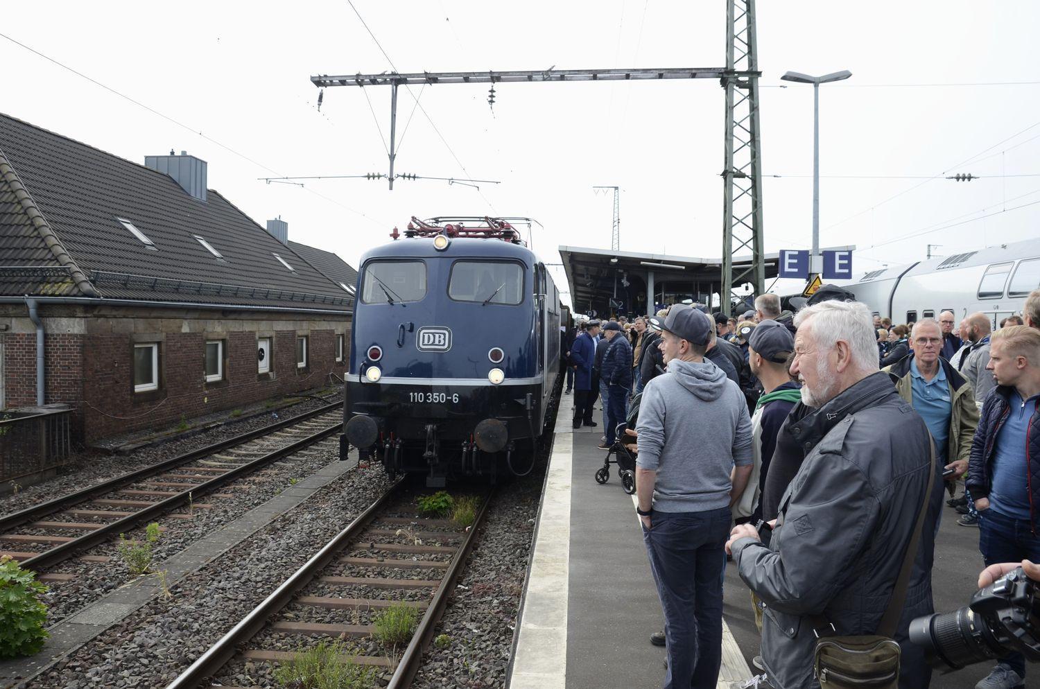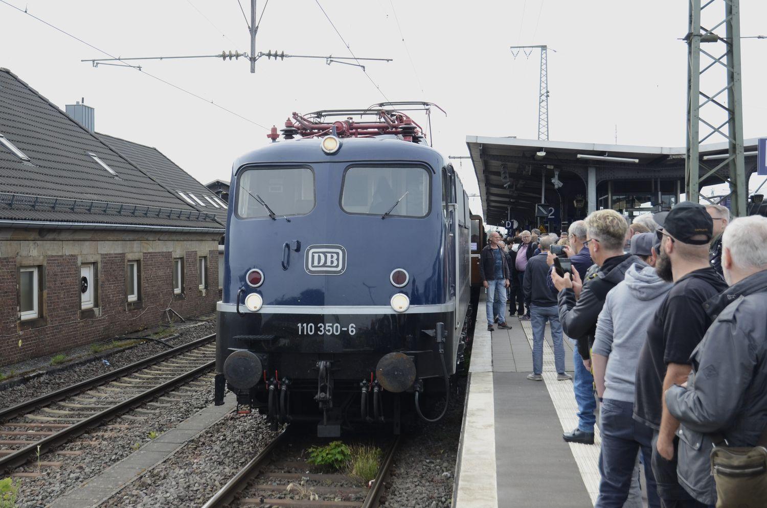 Wie vor 50 Jahren war der 31. Mai 2025 ein Samstag und lag auch mitten im langen Wochenende zum Himmelfahrtstag. Neben dem Wochenende zuvor mit einer ersten Tour an die Küste, bot sich daher auch der „Vatertag“, 29.5., als Termin für einen Sonderzug an. Und der wurde in Form einer Rundfahrt über die alten Einsatzstrecken der 01.10 von Osnabrück über Rheine, Leer, Oldenburg und Bremen wieder nach Osnabrück gestaltet. Betrieblich anspruchsvoll war die Sache dennoch, da die Brücke über den Dortmund-Ems-Kanal in Rheine-Rodde trotz erfolgter umfangreicher Sanierungen nach wie vor nicht wieder für die Streckenklasse D4 zugelassen werden konnte. Daher bespannte bis Rheine 110 350 den Zug. Ab Rheine dann aber 3/4-Takt bis hin zum 01.10-typischen Röhren und der „Zwiebel“ über dem Schornstein. Der Nachmittag brachte zwar leichten Regen für die Rückfahrt nach dem Aufenthalt in Bad Zwischenahn, aber der hat weder der Schnellzugdampflok und ihrer Mannschaft noch den Fahrgästen die Stimmung getrübt. Nach abschnittsweise 120 km/h auf der „Rollbahn“ ging es ab Bohmte mit scheinbarer Leichtigkeit die Rampe zum Wiehengebirge nach Vehrte hinauf – unzählige Bilder entstanden zum Ende des Planeinsatzes der 01.10 Ende der 1960er-Jahre hier und können heute in der Literatur oder im Netz bestaunt werden. Angekommen in Osnabrück wurde im Vorbahnhof Schinkel wieder umgespannt auf 110 350. Während die Dampflok über Münster den Weg nach Rheine nehmen musste, brachte die schmucke E-Lok den Zug mit Halt in Osnabrück-Altstadt (anstelle des Hauptbahnhofs) weiter nach Rheine.