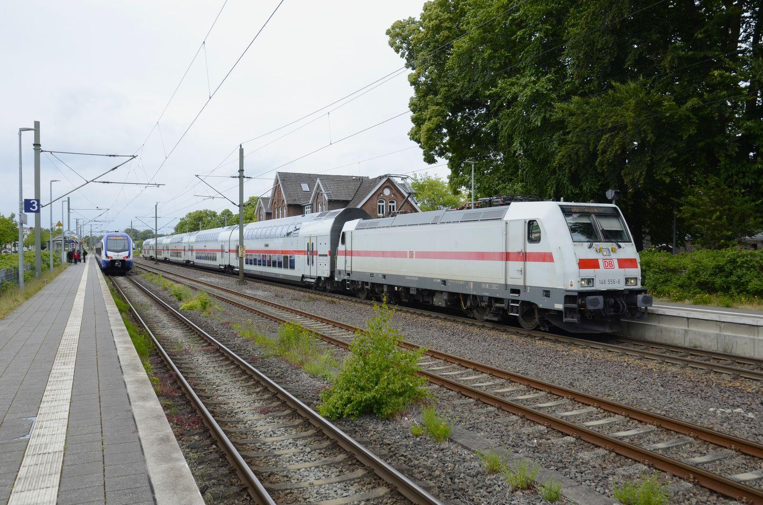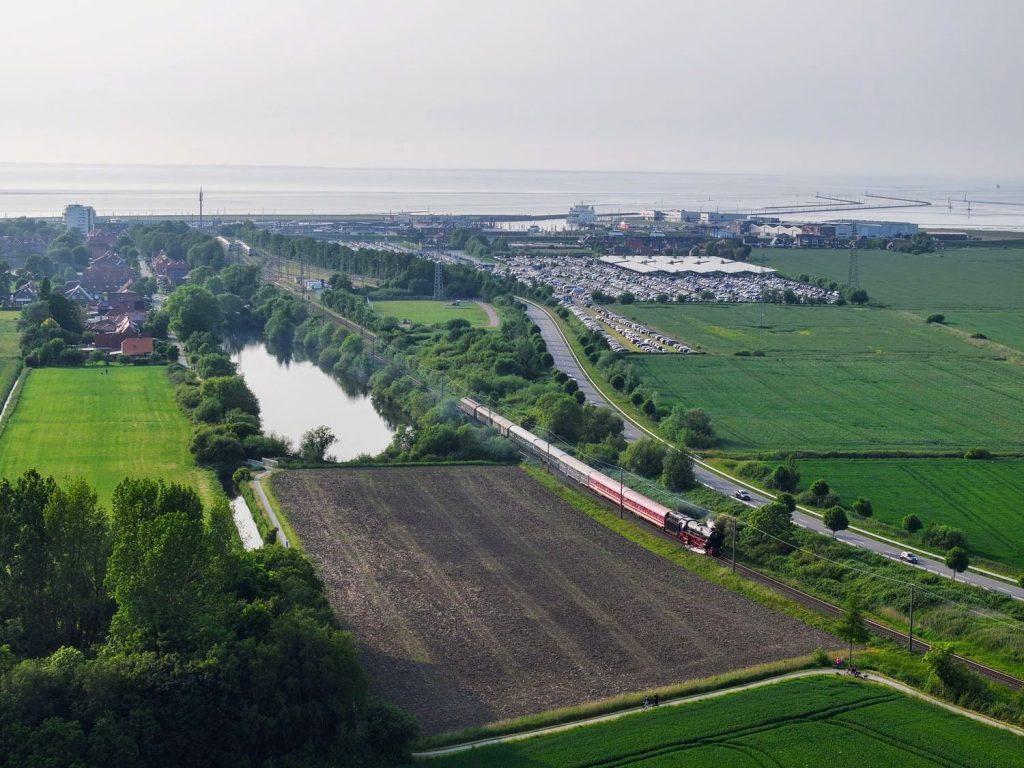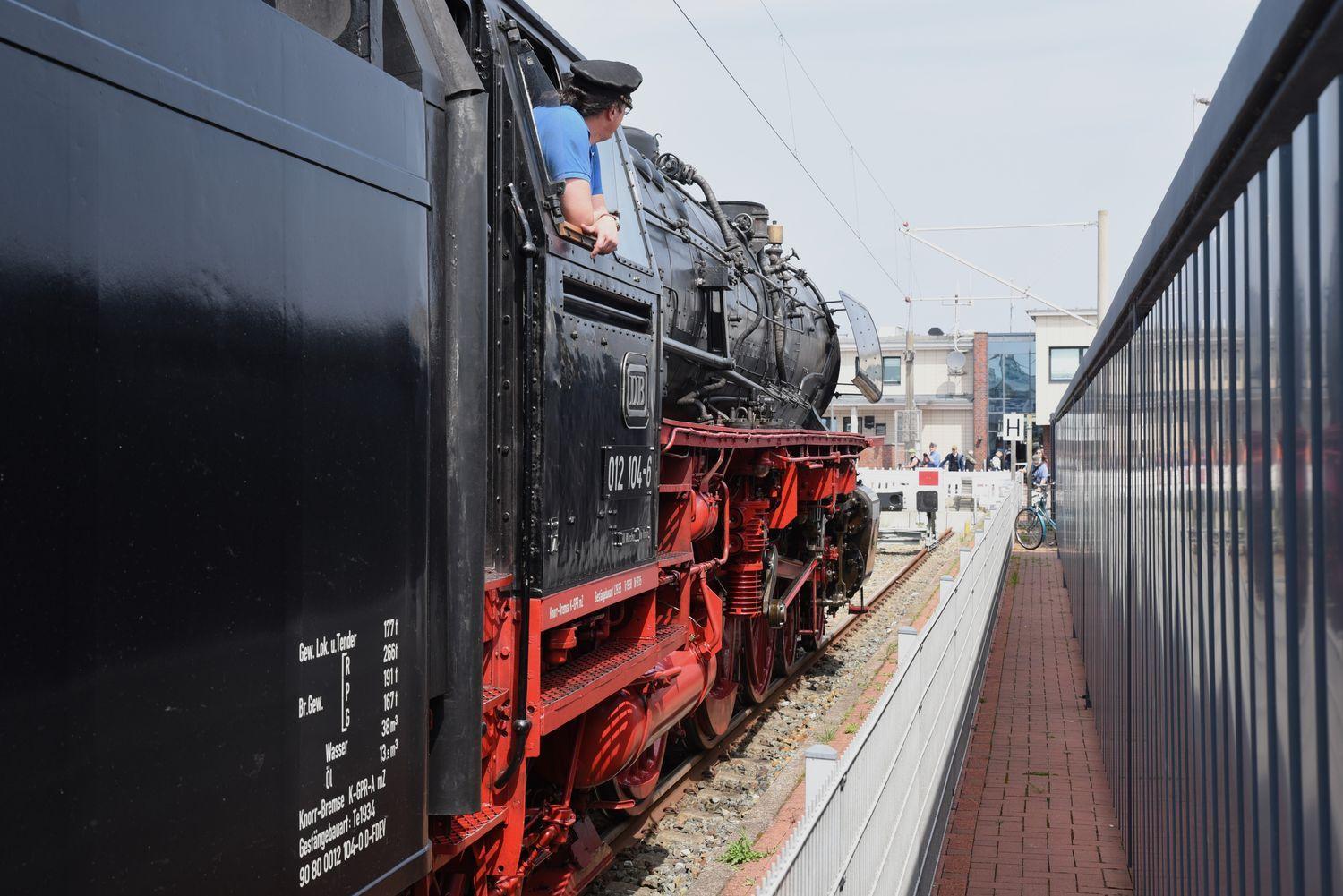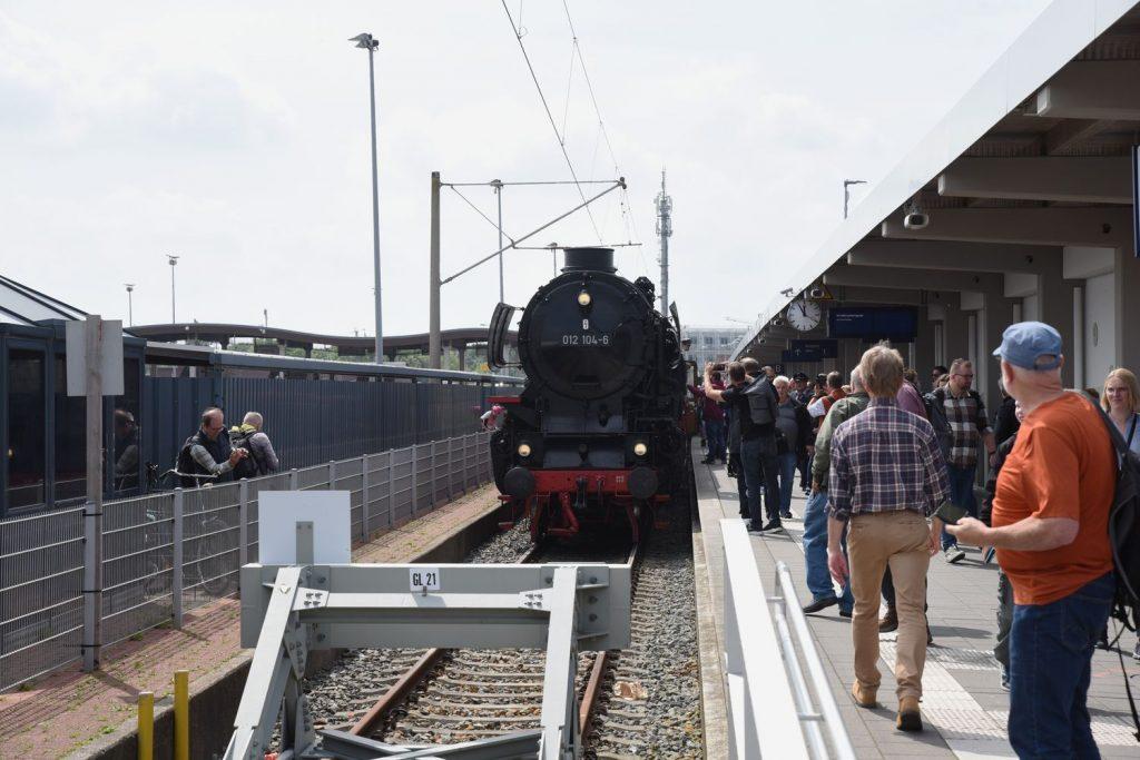 Zwei Tage später dann also „Jahrestag“: Von Lippstadt wiederum mit 110 350 kam der besondere Sonderzug in Rheine an, wo 012 104 zuvor ihre letzte Gastnacht im „Bw“ auf dem Gelände der Firma Windhoff verbracht hatte. Verspätungen des Regelverkehrs brachten auch den Ablauf der Sonderfahrt etwas durcheinander. Der vorgesehene Fotohalt in Meppen wurde ein Überholungshalt in Lingen, dennoch erreichte der Zug pünktlich um kurz vor 12:00 Uhr die Mole in Norddeich. Die Rückfahrt ab dort war für 18:55 Uhr angesetzt, annähernd die gleiche Zeit, zu der 50 Jahre zuvor der D 714 letztmals mit einer 012 bespannt dortselbst angekommen war.