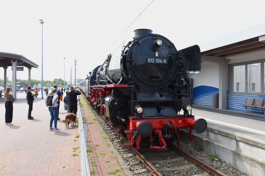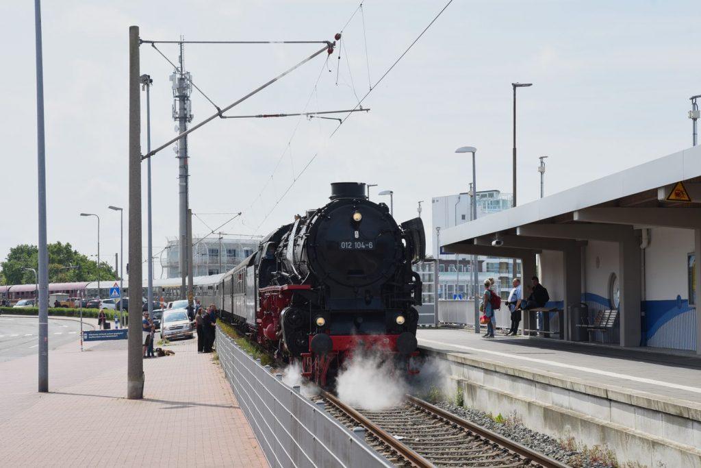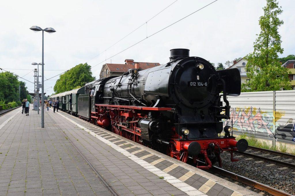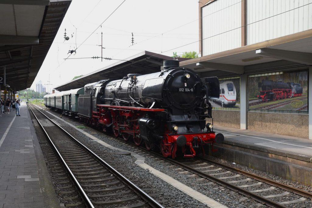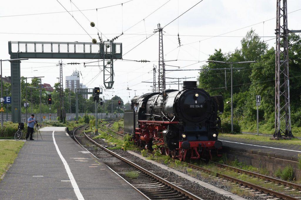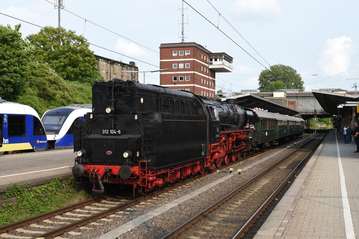 Eine Zugabe brachte dann noch der 1. Juni 2025, wo 012 104 den „Anheizertag“ der Osnabrücker Dampflokfreunde bereicherte. Die seit knapp 2 Jahren wieder betriebsfähige Schnellzuglok hat auch dort für einen hohen Besucherzuspruch gesorgt, nicht zuletzt, weil sie vier der fünf Pendelfahrten vom Zechenbahnhof Piesberg zum Hauptbahnhof Osnabrück bespannte – trotz der Problemstelle an der Stützmauer nahe dem Haltepunkt OS-Altstadt. Nachdem zum Fahrplanwechsel im Dezember 2024 auch hier die Streckenklasse auf D2 herabgesetzt worden war, wurde kurz zuvor das Richtungsgleis nach Westen wieder für D4 freigegeben – so war es in der ersten Kundeninformation der DB InfraGo AG Ende Oktober 2024 bereits vorgesehen, Ende November 2024 wurden aber vorübergehend doch beide Streckengleise herabgestuft. Somit konnte die 012 im Gleiswechselbetrieb zum Hauptbahnhof verkehren, wozu aber kurzfristig noch die Fahrzeiten der Pendelzüge anzupassen waren.