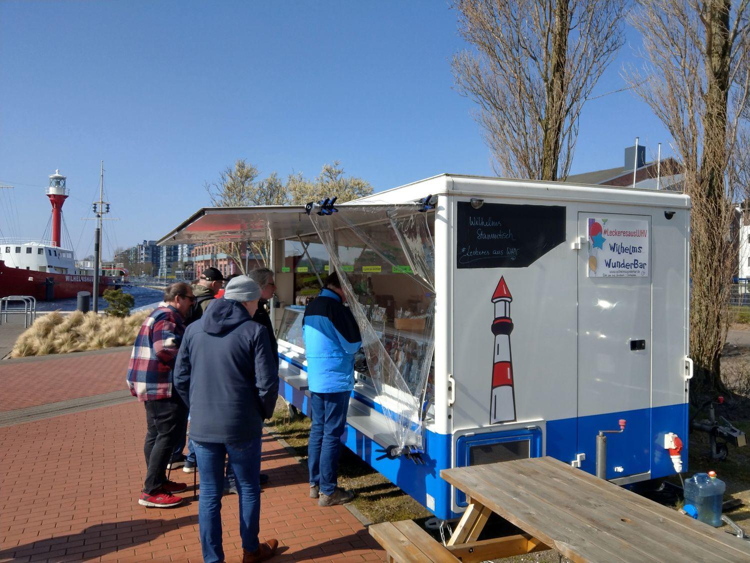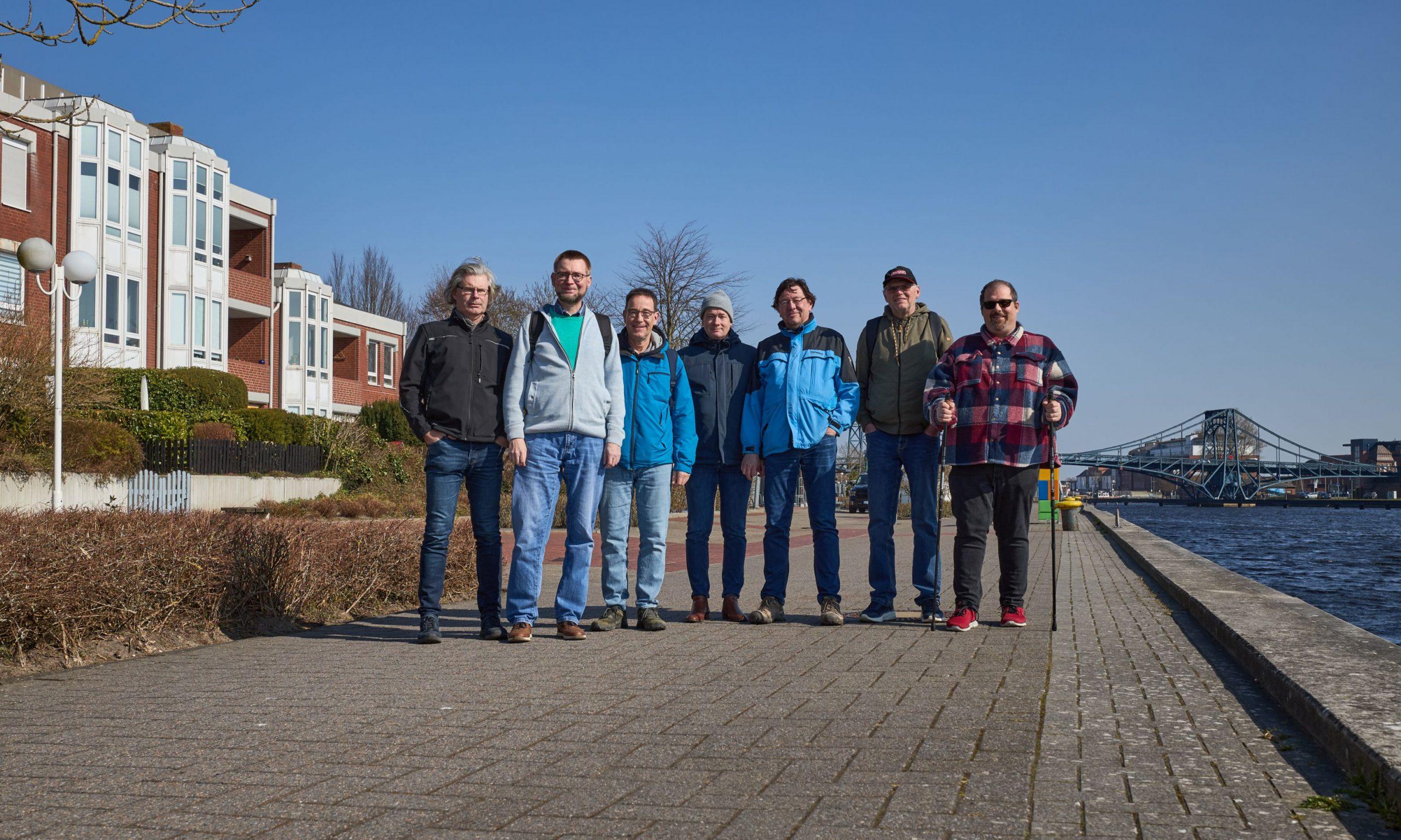 Spaziergang entlang des Bontekais im Wilhelmshaven bei zwar merklichem Wind aber ansonsten perfekten Bedingungen. Gruppenfoto von Links: Dietmar Weber-Werning, Michael Wernke, Klaus Heisler, Andreas Evels, Jens-Uwe Carstens, Ludger Preckel und Marcus Tesker.