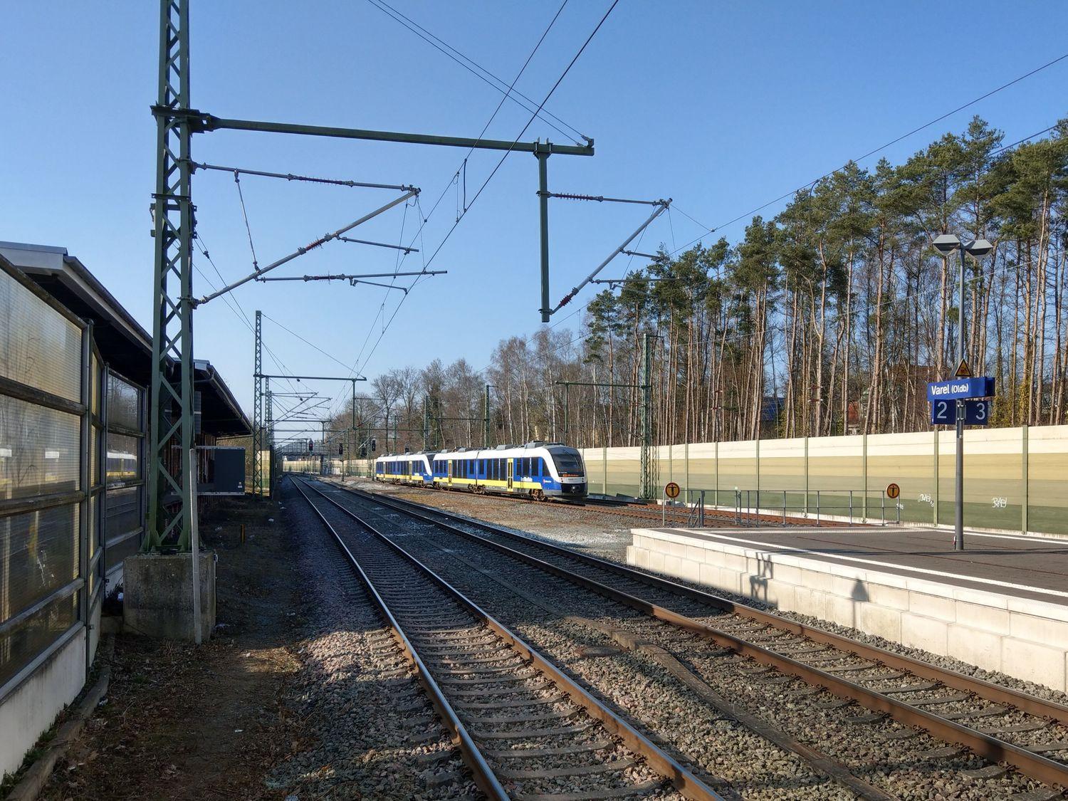 LINKS: Angekommen in Varel, zunächst ein Blick auf eine gen Wilhelmshaven ausfahrende Nordwestbahn. Die LINT-Garnituren wirken eingerahmt von Schallschutzwänden und Oberleitung geradezu verloren…