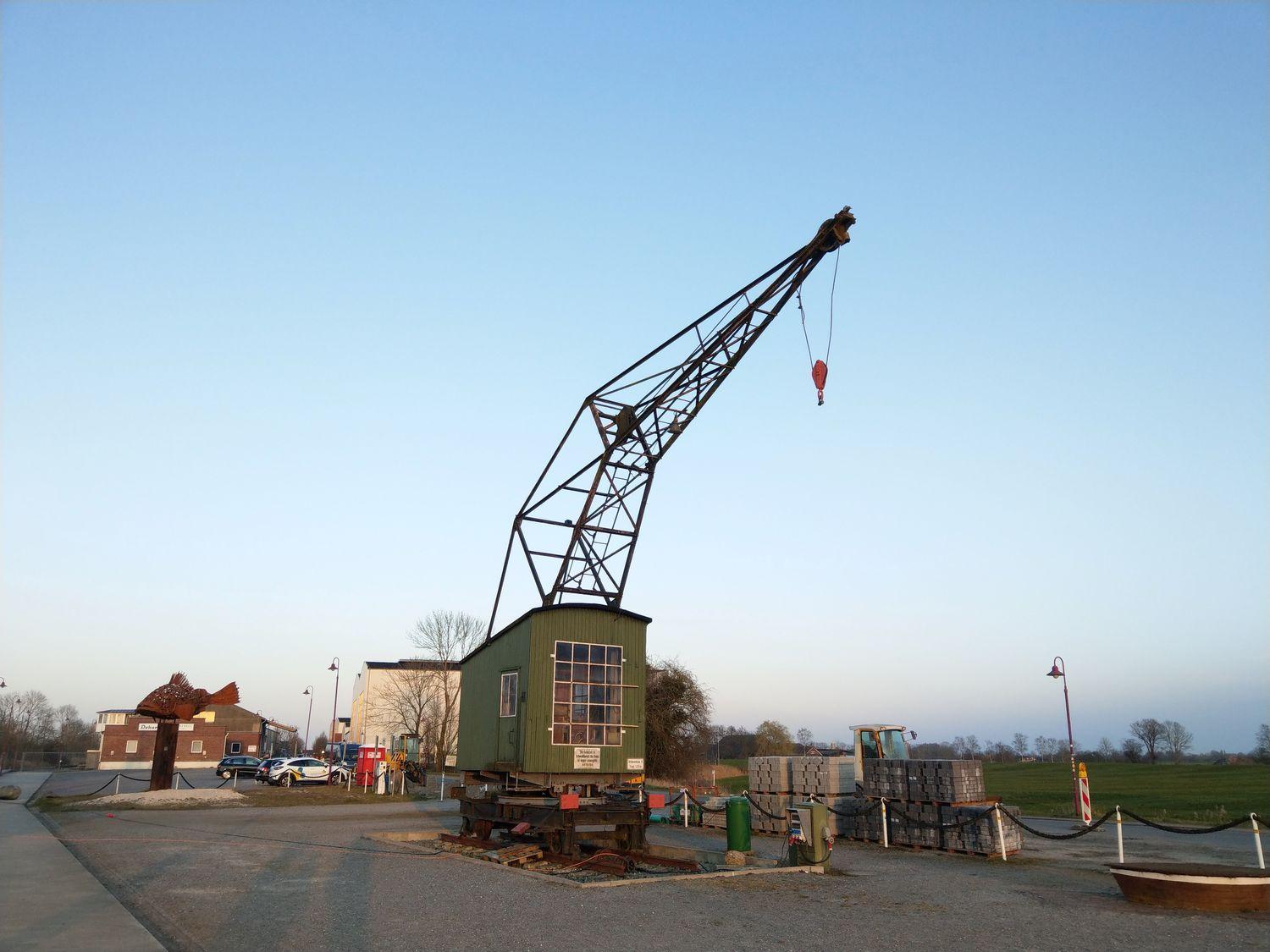 MITTE: Ein alter Schienenkran steht als Denkmal auf dem Areal der Hafenpromenade.