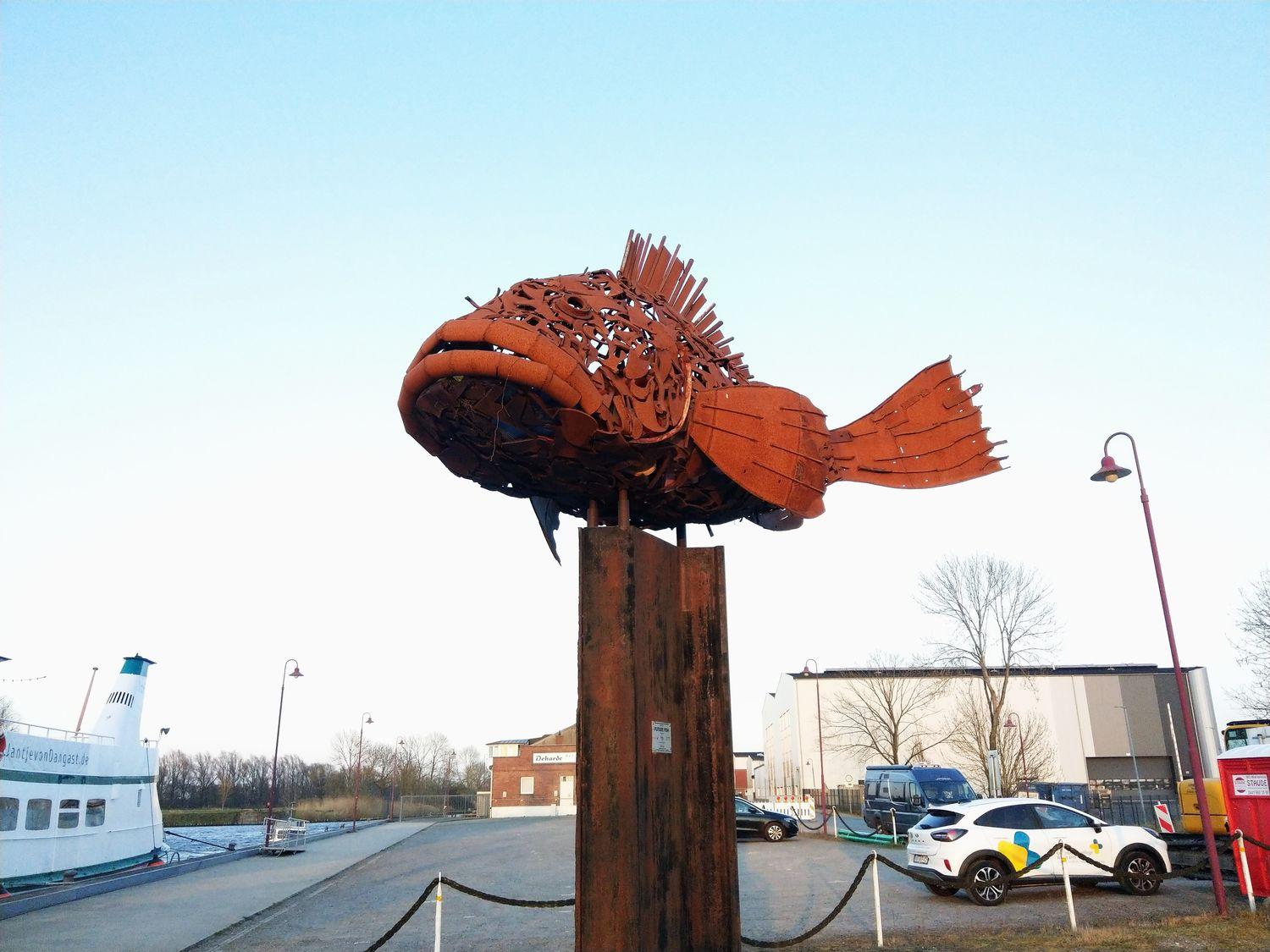 RECHTS: Der „Future-Fisch“ – Ein Kunstwerk, das auf die Problematik von Plastikmüll in den Meeren aufmerksam machen soll, wurde 2019 von der Interessengemeinschaft Vareler Hafen mit dem Schrottkünstler Diedel Klöver realisiert.