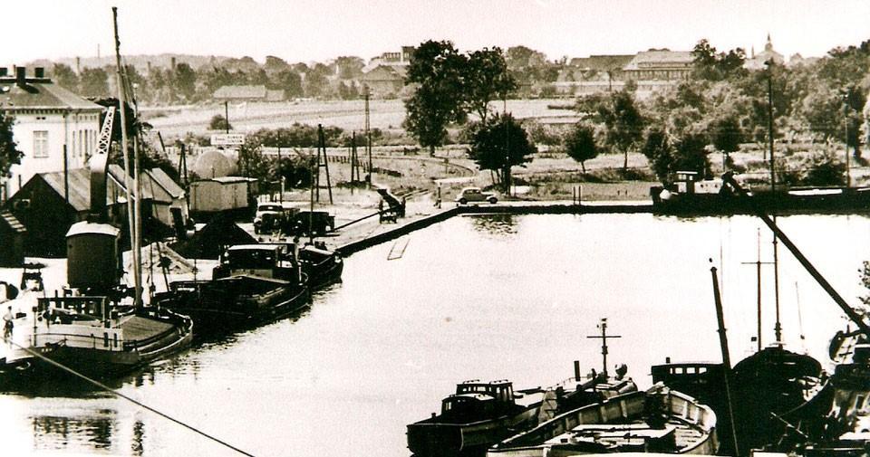Die frühere Einfahrt der Anschlussbahn in den Hafenbereich mit der alten Brücke – die Trassenführung ist noch sehr gut zu erkennen.