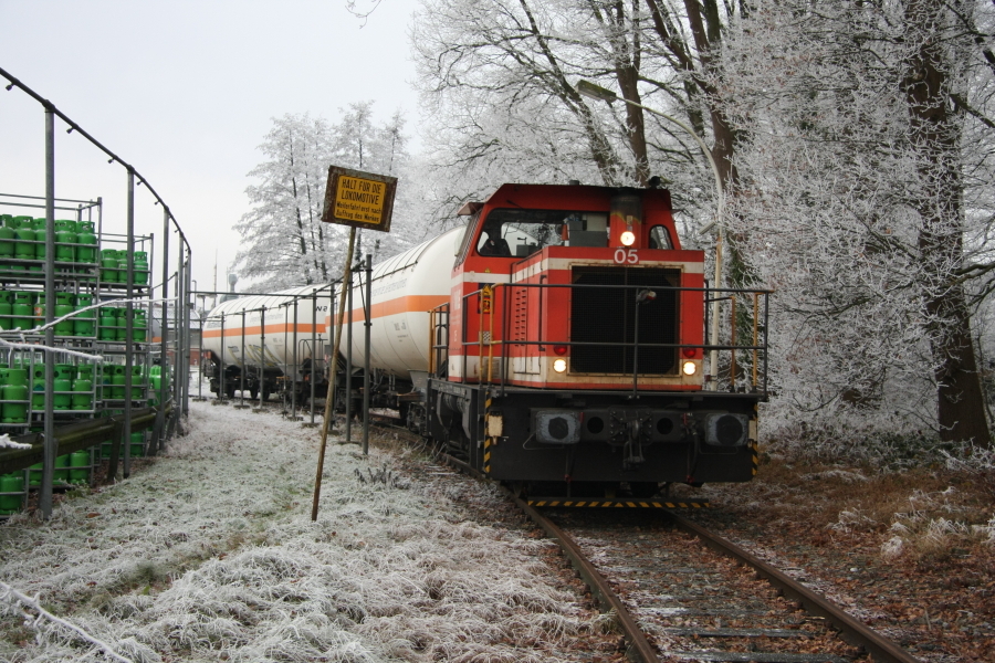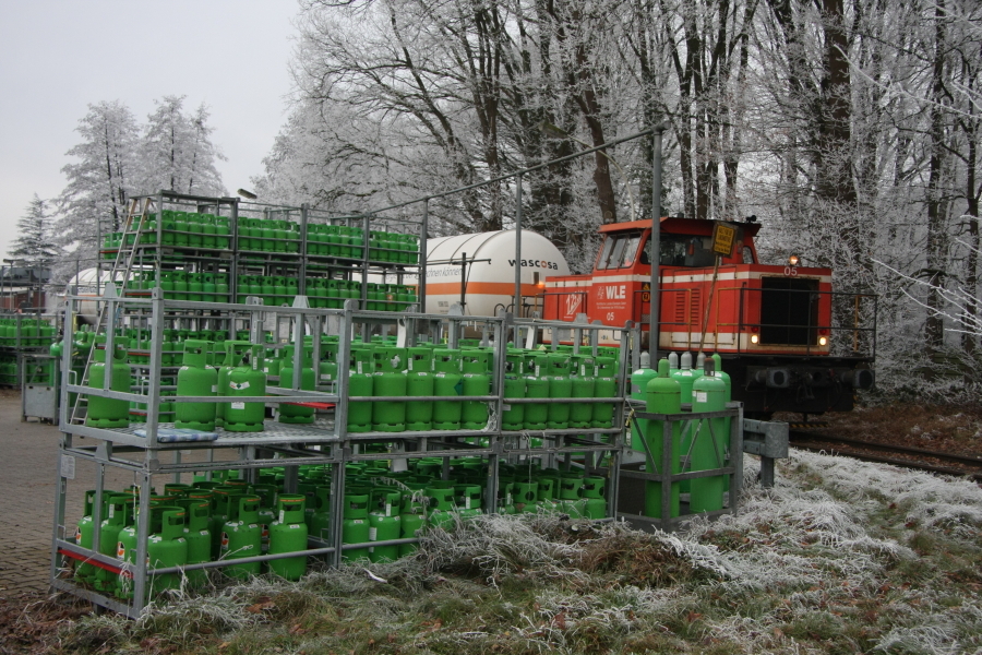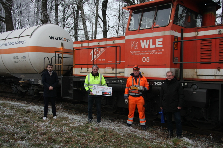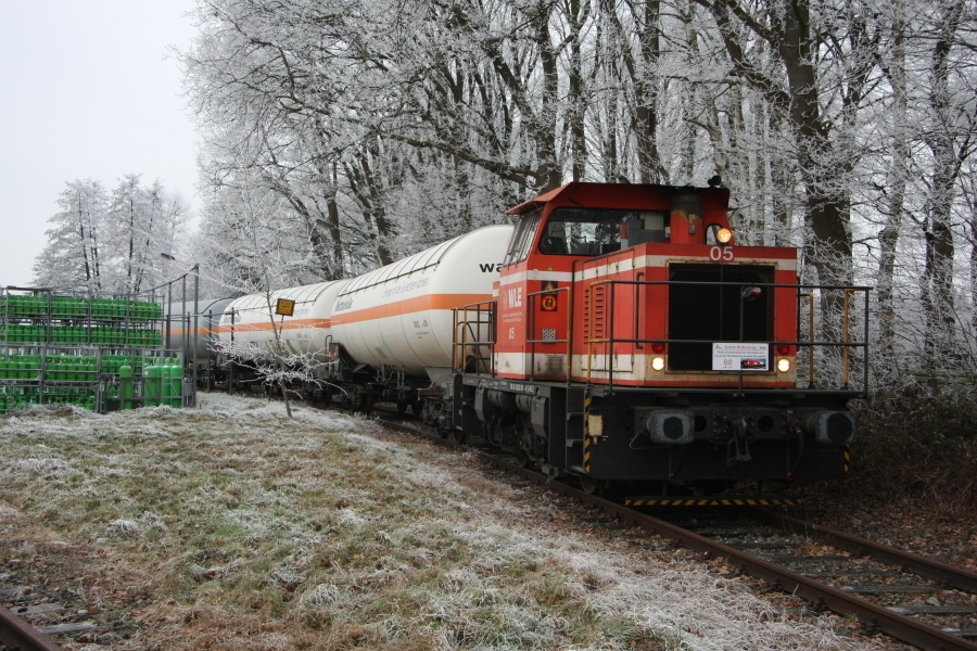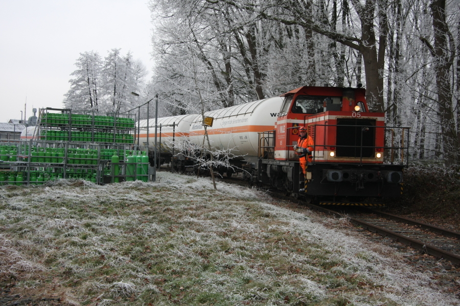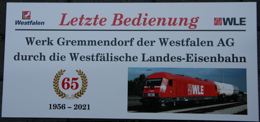 Am 23.12.2021 ging dann eine Ära zuende: Nach 65 Jahren partnerschaftlicher Zusammenarbeit zwischen der Westfalen AG und der Westfälischen Landes-Eisenbahn GmbH (WLE) zog Lok 05 der WLE an diesem Tag die letzten vier befüllten Druckgaskesselwagen aus dem Werksgelände mit Ziel Krefeld in Richtung Neubeckum ab. Vertreter der Westfalen AG und der WLE sowie einige Eisenbahnfreunde aus dem Münsterland nahmen an der Verabschiedung teil, zu der eigens entsprechende Zuglaufschilder angefertigt wurden.