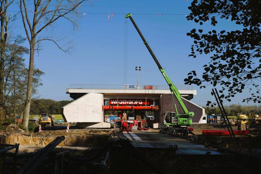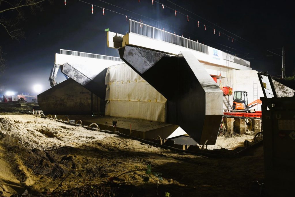 Die örtlichen Gegebenheiten erlaubten es, den Neubau zunächst nebenan auf einem Acker zu errichten, um ihn später in einer mehrtägigen Sperrpause in die finale Position zu bringen. Nach Einrichtung der Bauflächen Ende 2023 begannen im Frühjahr 2024 die Beton- und Stahlbetonbauarbeiten für die neue Brücke. Gleichzeitig wurde der Frischhofsbach im Baufeld verrohrt, um die Zugänglichkeit der Baustelle zu gewährleisten und eine betonierte Fahrbahn für den Einschub des Neubaues herzustellen. Anfang Oktober 2024 war der Neubau soweit fertiggestellt, dass die niederländische Schwertransport-Firma Wagenborg mit der Installation der Technik für den Verschub beginnen konnte. In der Vertikalen wurden vier sogenannte Kletterpressen unter dem Überbau installiert, um das Bauwerk anheben zu können, zwei Spannzylinder in Querlage sorgten für Stabilität. Für den Verschub waren in vier Gleitbahnen verlegte Hydraulikpressen zuständig. In einer elftägigen Sperrpause der Bahnstrecke Ende Oktober wurde dann zunächst die alte Brücke abgebrochen, die Baulücke im Bahndamm aufgeweitet und die Aufstandsflächen für die neuen Widerlager vorbereitet. Der Einschub der neuen Brücke wurde für den 25. Oktober 2024 terminiert. Alles verlief wie geplant und am Morgen des 25. Oktober konnte der Brückeneinschub in Mesum beginnen. Über einen Zeitraum von rund 15 Stunden wurden zentimeterweise zunächst knapp 50 Meter in der Horizontalen zurückgelegt, bevor das rund 2000 Tonnen schwere Bauwerk noch um 2 Meter in die vorbereiteten Baugruben abgesenkt wurde. Am folgenden Wochenende wurden beidseits die Lücken im Bahndamm verfüllt und in den letzten Oktobertagen die Gleisbauarbeiten erledigt. Noch bis in den Sommer 2025 zogen sich dann die Arbeiten zur Wiederherstellung des Bachlaufes und das Beräumen des Baustellengeländes.