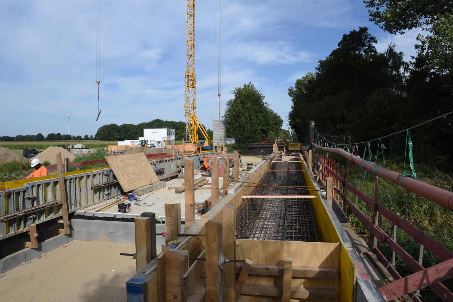 Anfang September erfolgte das Betonieren der sogenannten Kappen, damit sind die seitlichen Teile des Überbaues gemeint, die auch Kabelkanäle enthalten. Während der Bauphase wurden die Kabelstränge mit einem Provisorium aus Stahlträgern und einer Tragseilaufhängung über die Vechte geführt.