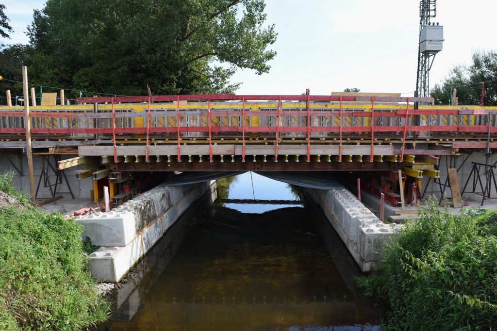 Dieser ging aber recht zügig voran und nach dem Abbruch des Altbauwerks ragten schon Ende Juni die jeweils vier Bohrpfähle zu beiden Seiten des Flussbettes aus der Erde. Um diese herum entstanden anschließend die Baukörper für die Widerlager und anschließend der Überbau.